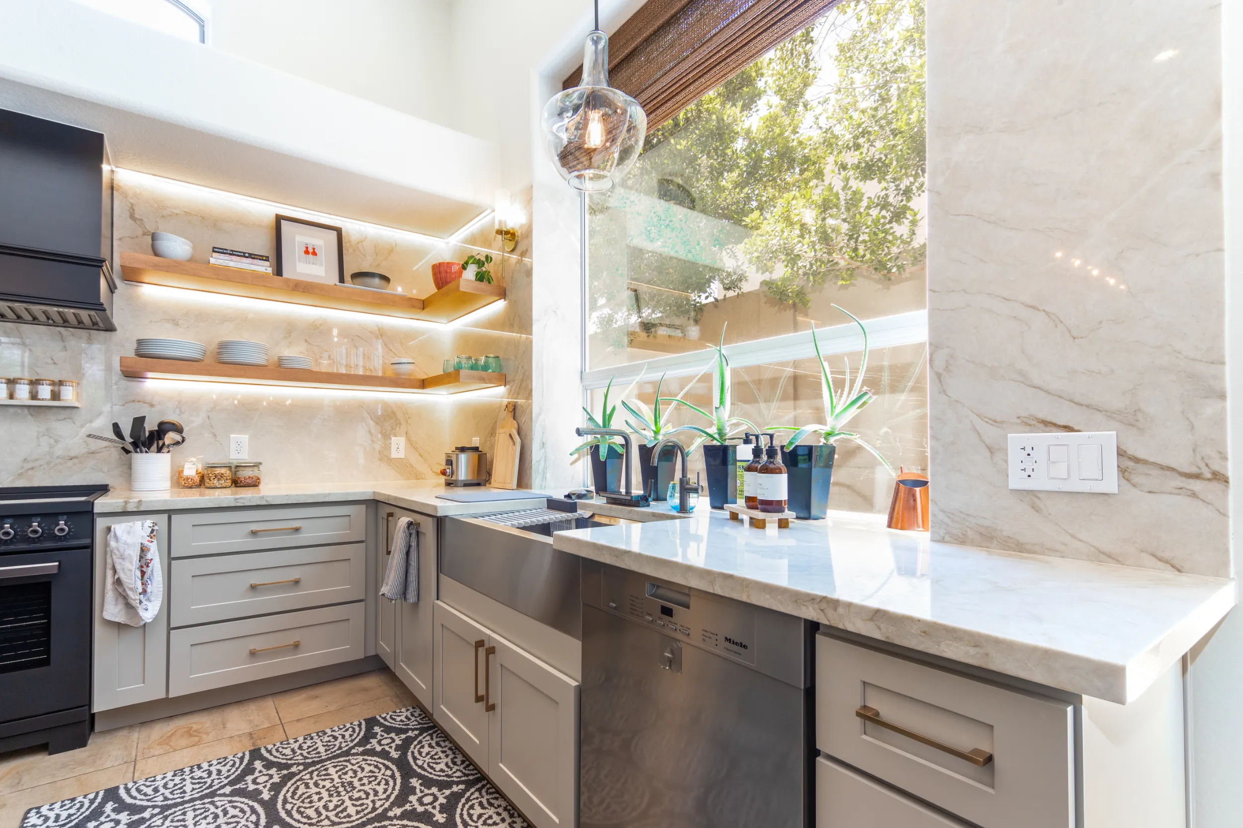 This kitchen renovation blends modern elegance with functionality. Taj Mahal Quartzite graces the full-height backsplash and countertops, complemented by custom cabinetry throughout. Innovative features include an appliance garage, spice ledge above the range, and floating shelves. A large island and specialty bar area enhance the space for cooking and entertaining. State-of-the-art appliances and strategic lighting complete this contemporary culinary haven, creating a stylish and practical space for daily use and social gatherings.