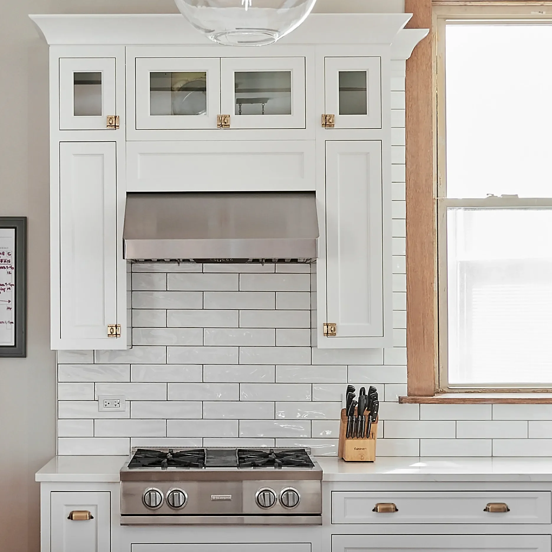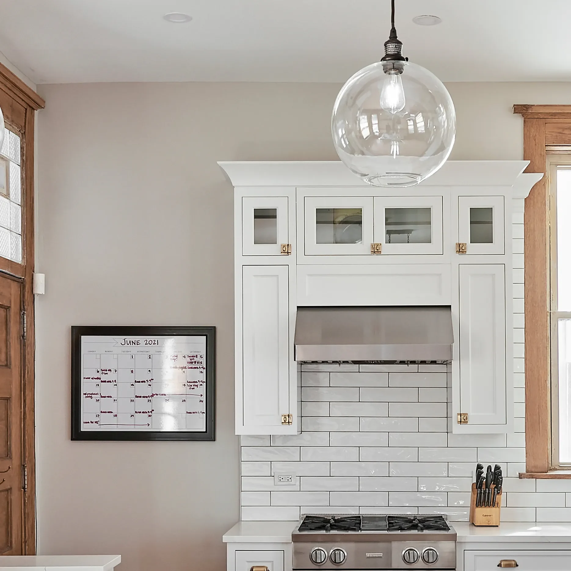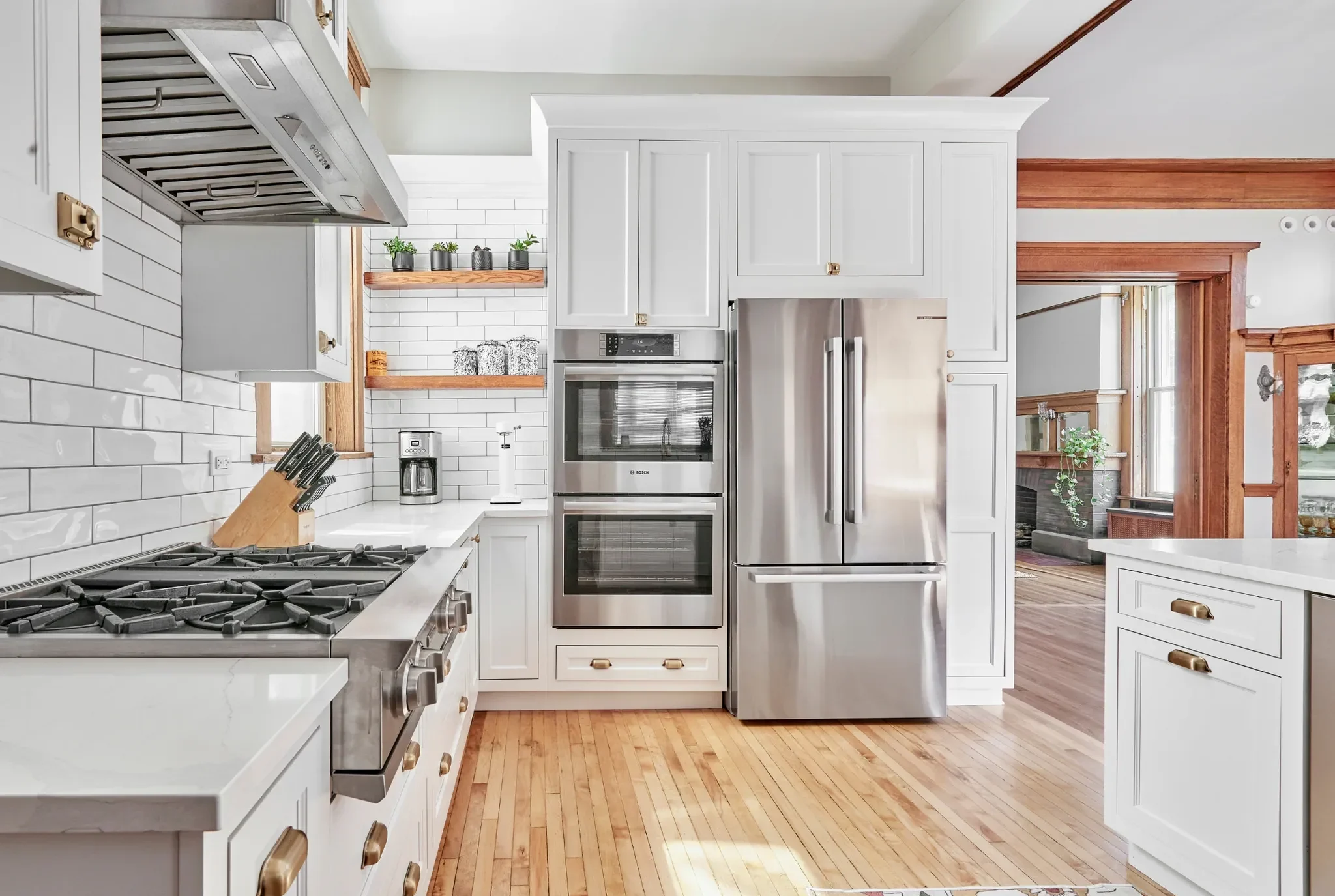 This traditional home needed an update, but with a little fun flair. The new eclectic modern kitchen is beautiful with white cabinets, brass fixtures and exposed wood beams. We maximized storage by adding extra cabinets and extending them to the ceiling, finishing with a traditional crown to match everything else in the room. The condo’s kitchen and bathroom are a more modern take on black and white hexagonal tile.